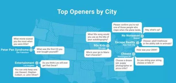 根据城市来分类(这里是美国),波士顿喜欢“有趣、无厘头”的,纽约喜欢“逃避现实”的话题,华盛顿喜欢比较“复古”的话题,芝加哥更是把话题停留在“90年代”,旧金山比较喜欢聊小时候,洛杉矶喜欢“娱乐圈”。基本上,每个城市的人都是围绕城市实际风格而谈话。(这个可以大家根据自己的城市想一些话题)