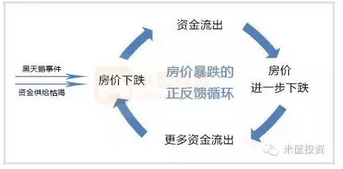 住户中长期贷款.png 住户部门中长期贷款绝大多数为房贷,所以可把二者数据等同。由图可知:从2015年起,房贷新增数额就大幅上升,而到了2016年增幅更大,半年的新增额已接近2015全年数额,这正是这波一线城市和部分二线城市房价暴涨的“元凶”。 房价会永远的正反馈循环下去吗?当然不是。 房价什么时候会跌呢?黑天鹅事件! 在说房价是否会跌之前,我们回顾下最近的一次股市泡沫破灭经过。 2014年下半年起,股市企稳上涨,到了2015年春节后,股市发力暴涨,直至6月到达5178最高点,两市单日成交金额高达2.4万亿,而后崩盘跌至最低2850点,至今一蹶不振。 至今仍记得,沪指突破5000点时,大家观点一致认为挑战上次高点6214势在必得,看高8000点、10000点的比比皆是,事与愿违的是股指却掉头向下一路暴跌。而其引信却是政府打击配资、减两融(融资/融券)、去杠杆,这也成为上次股市暴跌的非人为因素——黑天鹅事件。 回到房价,其破灭的原因将会跟股市一样,术语是外部流入性资金枯竭,翻译成人话是钱不再流入了,而这需要一个黑天鹅事件,遗憾的是没人知道它会在什么时候发生。 目前可想到的黑天鹅事件是: 1、房价暴涨至风险累计到一定量,金融机构主动收缩房贷,使资金流入减少; 2、央行停止放水、收缩信贷量,致使市场上的M2减速加大(减少基础货币投放及提高存准率来降低货币乘数); 3、房价过高致使首付提高和月按揭款增加,“新韭菜”的收入增幅跟不上房价涨幅,再无“接盘侠”; 4、出台房产税,增加购房者的持有成本; 5、国家出于经济调整需要(如抑通胀等)连续加息…… 一旦触发黑天鹅事件,上涨正反馈循环随即转入下跌正反馈循环,如图: